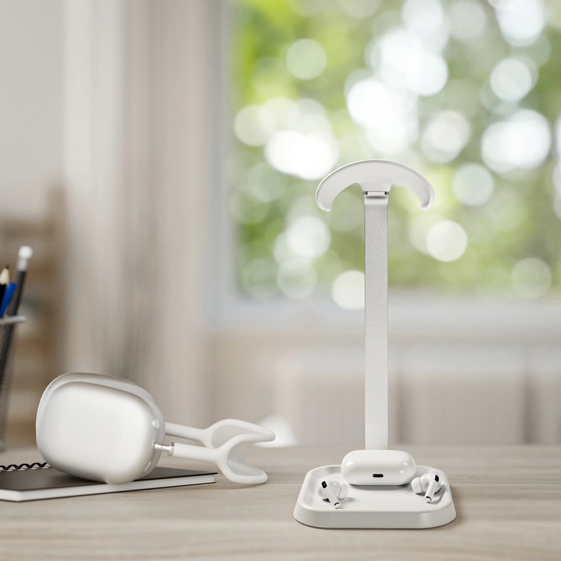 Keep your desk clean, organized, and stylish with this premium headphone stand with AirPods holder. Designed to protect your headphones, the curved support preserves their shape and reduces wear over time.
